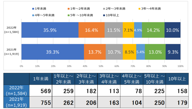 2021年と2022年を比較すると、1年未満の割合が減ってはいるものの、1年~2年未満の人は1年未満の人の半分程度なのがわかります。
