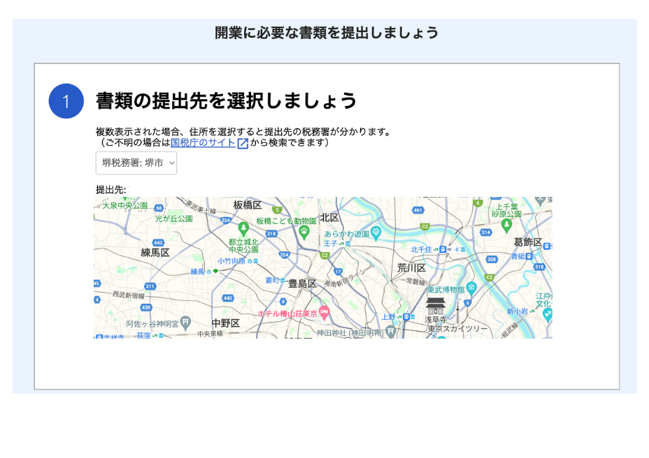 提出する税務署が地図と一緒に画面に表示されます。