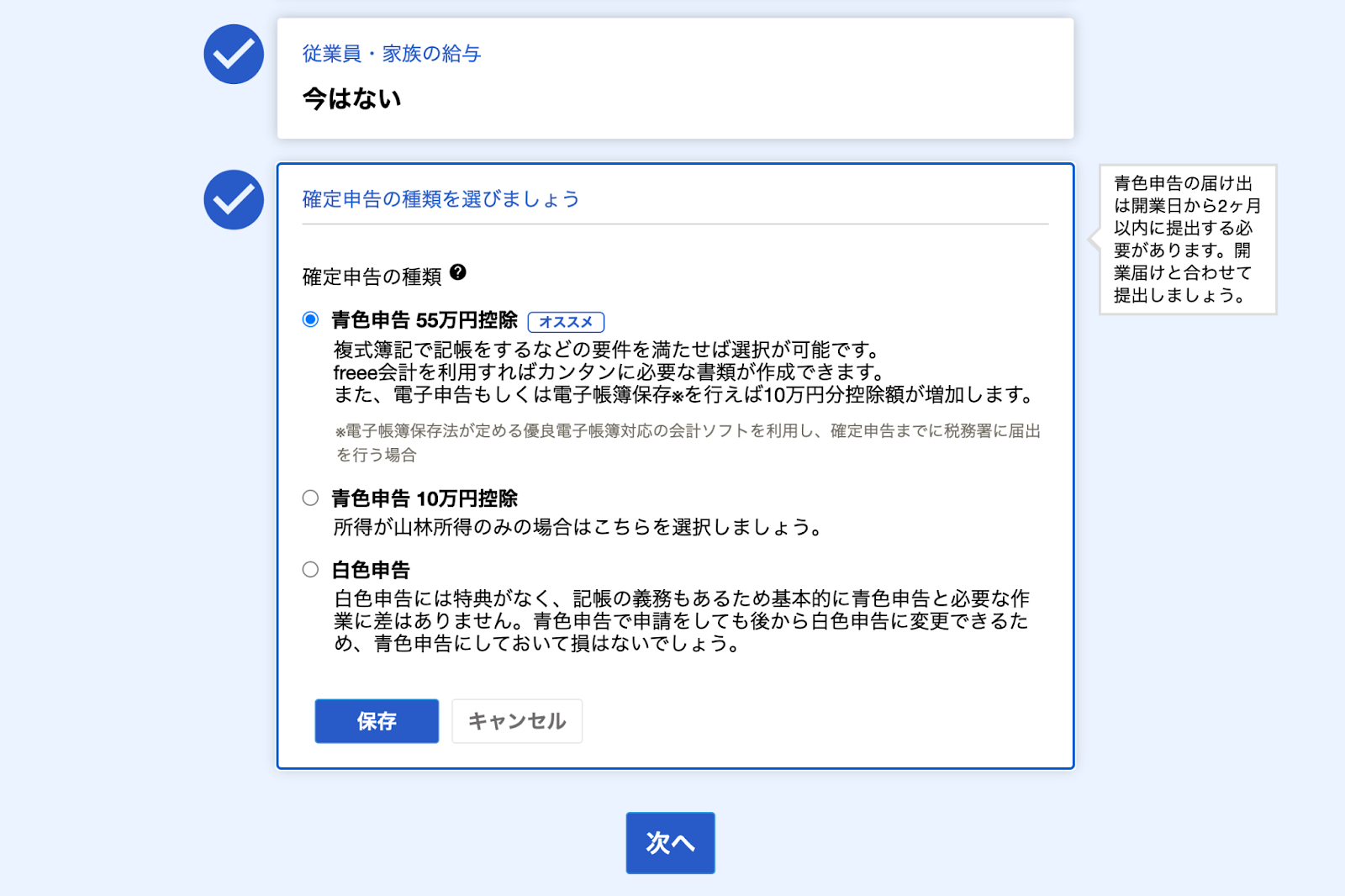 確定申告の種類は、青色申告55万円控除にチェックを入れます。